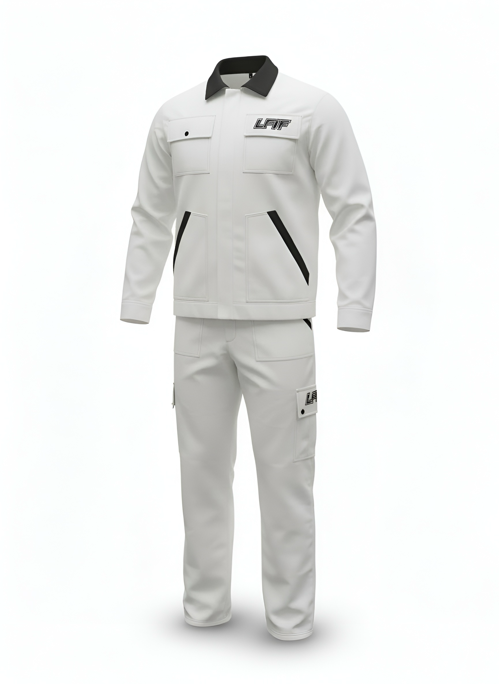 - The Jacket : Features a structured black contrast collar and a full -zip front for versatility. Dual chest pockets and angled side welts provide ample storage while maintaining a sharp professional frame.