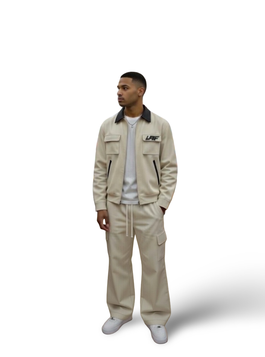 Rendered in a crip, authoritative sandstone beige/ white this set blends military-inspired utility with a sleek minimalist silhouette.